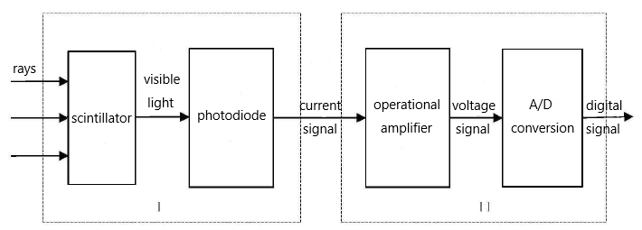 從探測器結構圖(圖2)可以清楚地看到工業(yè)CT探測器的信號轉換過程。首先,射線信號進入閃爍體,在閃爍體中產生可見光。光電二極管將可見光轉換為電流信號。然后,i-v轉換電路將電流信號轉換成電壓信號。最后,由AD轉換裝置將其轉換為數(shù)字信號,并傳輸至數(shù)據傳輸系統(tǒng)。