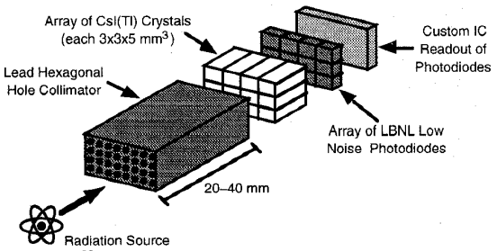 圖解說明了離散閃爍相機的模塊。該原型具有一個3×4像素陣列,每個像素由一個3×3?5 mm3 CsI(TI)晶體與一個3×3 mm2 PIN光電二極管耦合組成。讀出電路由兩個3×3 mm2的IC組成。可以從單個模塊的陣列中構造出具有有用成像尺寸的相機。
