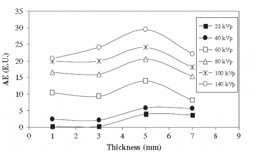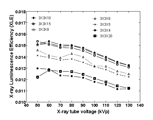 CsI(Tl)的最重要特征是其高光產率(≥104光子/ MeV),并且其發射光譜在約550 nm處具有最大值,與非晶和結晶硅光電二極管完全兼容。研究了CsI:Tl單晶閃爍體的發光效率與X射線乳腺攝影和一般X射線成像所用能量范圍內的晶體厚度和X射線管電壓的關系。