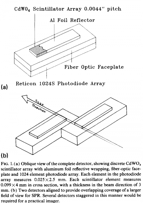 [參考文獻1]描述了一種用于X射線成像的高分辨率X射線檢測器陣列,它由CdWO4閃爍體的離散陣列和帶有光纖面板的Reticon 1024S光電二極管陣列組成。它開發了一種非常高分辨率的離散閃爍體陣列,用于扇形束X射線成像系統。